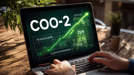 A person interacts with a laptop, which showcases a graph representing CO2 emissions. The image uses green and black tones, with an upward-trending line. The composition suggests an office environment, possibly related to environmental monitoring or business analysis. It is suitable for commercial and editorial purposes.