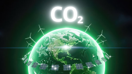 An image presents a glowing green globe encircled by wind turbines and solar panels. The digital rendering features bright lighting, a dark background, and a prominent 'CO2' symbol. This visual concept could be suitable for illustrating themes related to environmental issues, sustainable energy, or climate change solutions for editorial and commercial applications.