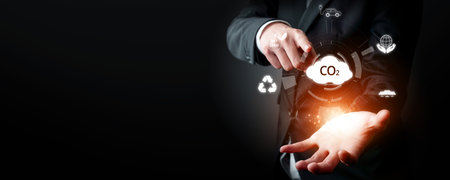 Business person implements initiatives to reduce CO2 emissions, aiming for net zero. Showcases commitment to sustainability by reducing CO2 for a greener planet. FaaS