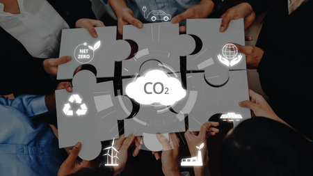 A diverse group of hands holds puzzle pieces symbolizing the collaboration needed to achieve net zero emissions, highlighting sustainability and environmental responsibility in business. Raster