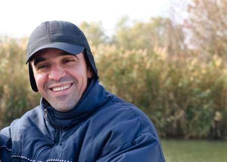 Happy man with a wide friendly smile wearing a blue cap and warm clothing, close up head and shoulders view