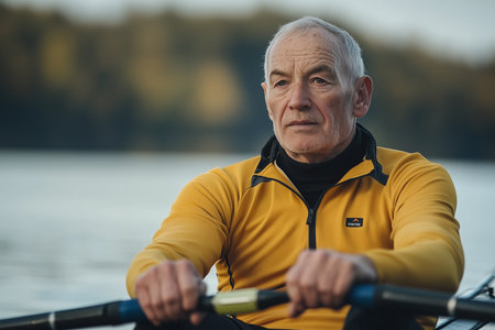 Senior man rows diligently in a competition on a peaceful lake, showing his dedication and skill amid the soft morning light reflecting off the water.