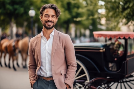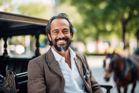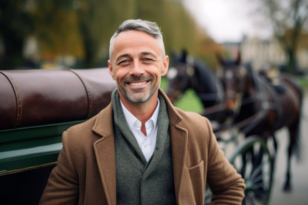 portrait of smiling middle aged man with horse drawn carriage in city