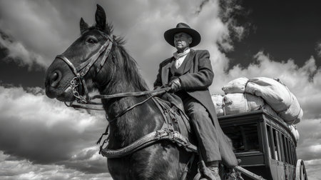 A cowboy sits on horseback beside a vintage wagon, highlighting rural life in a dramatic black and white scene. The clouds add depth to the landscape.