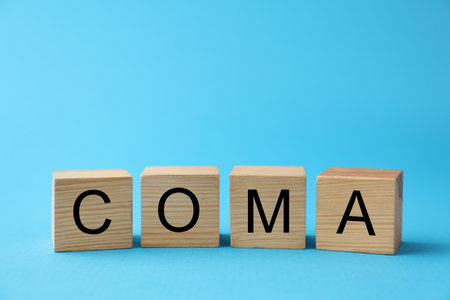 Wooden cubes with word Coma and pills on gray background, flat lay