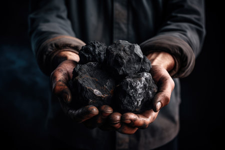 Coal miner's hands in gloves holding chunks of coal