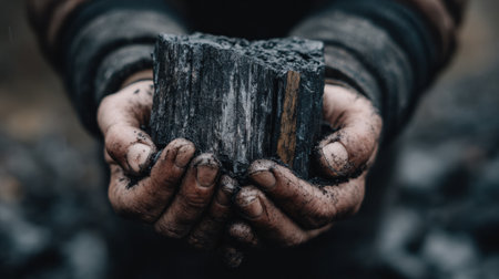 A person grips a chunk of raw charcoal, revealing dirt-covered hands, while surrounded by a dark, rugged environment during cloudy conditions.