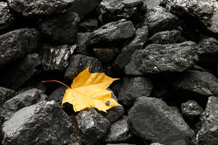 Maple leaf among pieces of coal. Autumn maple leaf on a black background. Yellow leaf on a dark background