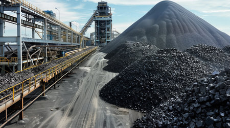 Black coal pile rises beneath conveyor belt structure unloading chunks of raw material in an industrial site