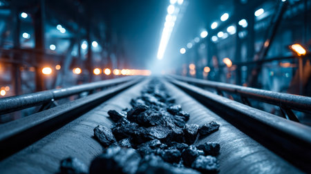 AI Generated. Coal moving along conveyor belt in coal mine