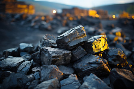 Close-up view of high-quality coal pieces on dark surface highlighting texture and shine, showing natural minerals in a mining area during midday