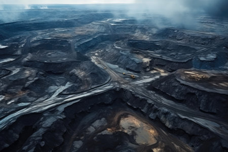 Coal mining industrial landscape. Heavy pollution, smoke, dust, ruined ecosystem. Generative AI.