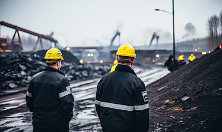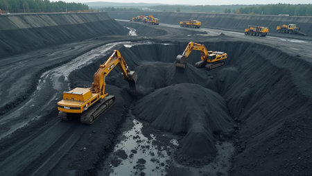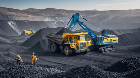 a mining site, with workers using heavy machinery to extract the coal, created with generative ai