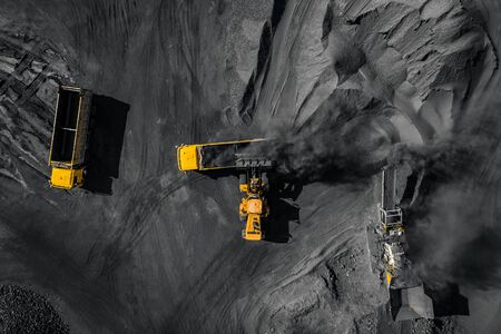 Open pit mine, coal loading in trucks, transportation and logistics, top view aerial. Concept industrial