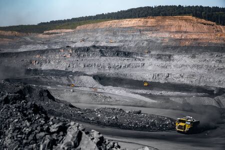 Large quarry dump truck. Big yellow mining truck at work site. Loading coal into body truck. Production useful minerals. Mining truck mining machinery to transport coal from open-pit production