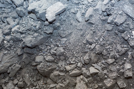A close-up of coal chunks on a rough, dark surface, with scattered coal dust. No people, copy space