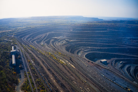 Aerial view open pit mine, loading of rock, mining coal, extractive industry