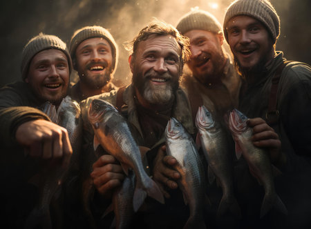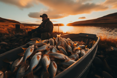 A fisherman with a fresh catch of fish in a net, on a boat at dawn. Evokes tradition, sustainable seafood, and the serene beauty of coastal life.