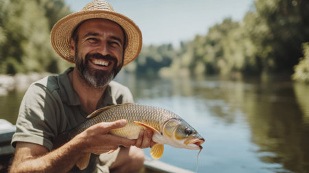 A happy man proudly holds up a large fish caught while fishing in a serene lake. His joyful expression captures the excitement of his outdoor adventure.