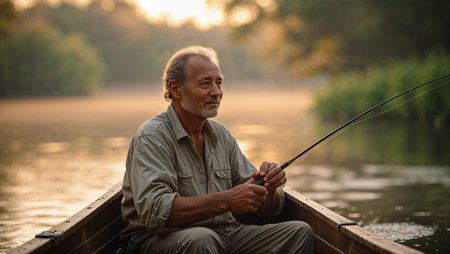 Fisherman enjoying the tranquility of dawn on a calm lake surrounded by nature