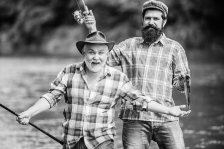 Two men friends fisherman fishing on river. Old father and son with rod fishing at riverside. Recreational activity.