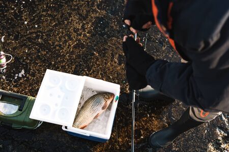 Fisherman is patiently waiting for a bite while fishing in the cold alaskan waters