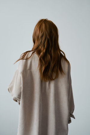 Portrait of young amazing redhead girl in beige shirt on neutral background. Long wavy healthy hair. beautiful and fresh. natural beauty. minimalism. soft light. good quality. hair advertising