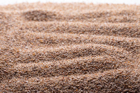 Sand texture close-up. Macrophotography. Small particles of different shades of beige, brown. Natural textured surface.