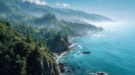 Verdant cliffs rise sharply above shimmering turquoise waters, their lush foliage blending seamlessly with a gentle morning fog as waves softly kiss the jagged coast