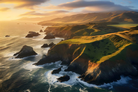 Stunning aerial shot of a dramatic California coastline at sunset. Golden light bathes the cliffs and ocean.