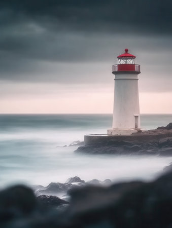 A lighthouse stands tall on a rocky coastline, surrounded by calm waters under a soft, muted sky. Perfect for creative templates.