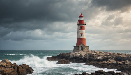 A tall, red and white striped lighthouse stands on a rocky outcrop as large waves crash against the shore. Dark clouds loom overhead, but the lighthouse beam shines brightly, a beacon of hope in the storm.