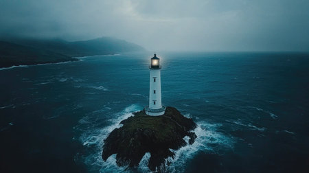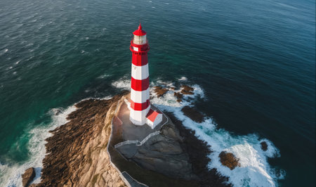 aerial view of a lighthouse, with its beacon shining bright against the dark waters, created with generative ai