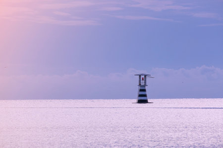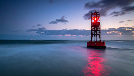 As twilight deepens, a solitary navigational buoy stands as a steadfast sentinel in the calm ocean.