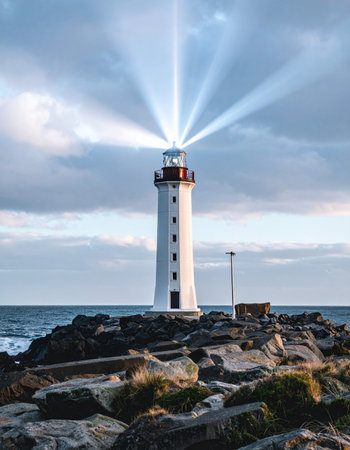 A powerful lighthouse stands firm on a rocky coast, its brilliant beam cutting through the twilight sky.