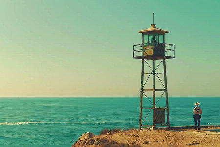 a stunning landscape of a solitary emergency light on a cliff by the sea, the sun setting on the horizon, the calm and serene ocean reflecting the warm colors of the sky, the gentle mist enveloping the emergency light, detailing every texture and detail. photography, 24mm wide-angle lens. ai generated