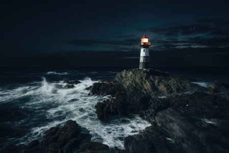 Lighthouse on rock and stormy seas at night, created using generative ai technology
