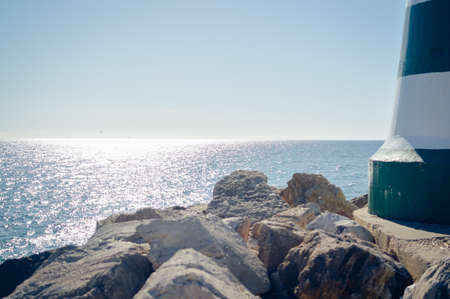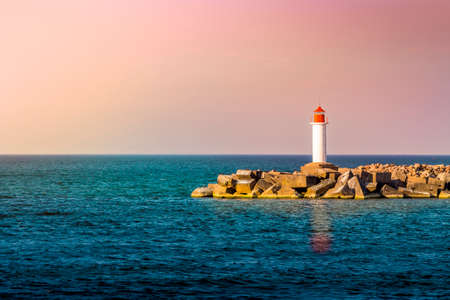 high lighthouse tower white and red color near sea shore port. construction building for navigator and signal safety. calm place for vacation sunrise
