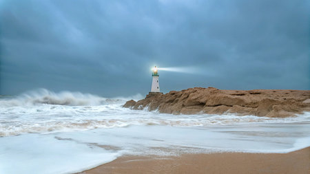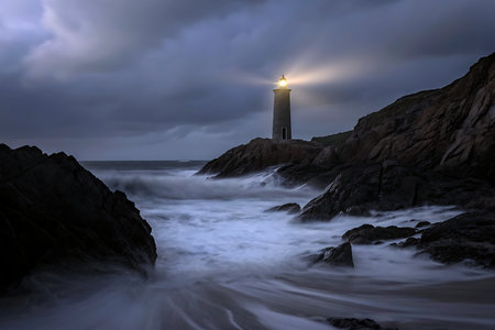 This captivating image features a majestic lighthouse standing resiliently on a rugged coastline amidst a stormy sky, casting light over the turbulent waves below.