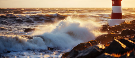 A lighthouse is on a rocky shoreline, with the waves crashing against the rocks. The lighthouse is surrounded by water and rocks, and the waves are high and powerful. The scene is dramatic and intense
