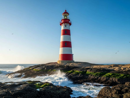 A stunning lighthouse stands tall on a rocky shoreline, where gentle waves kiss the stones. The sky is clear, capturing the essence of serene coastal beauty.