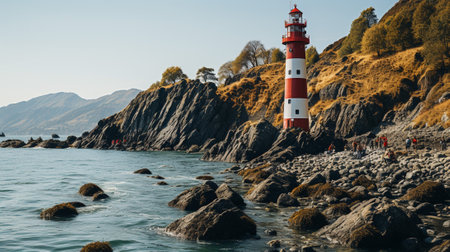 Majestic lighthouse perched on a rocky island, offering stunning views of the surrounding ocean and mountains. A serene escape into nature