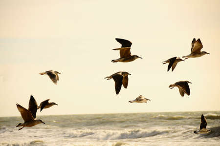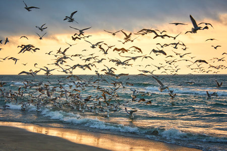 wildlife of birds, Lots of seagulls hovering over the stormy sea at sunset