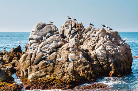 View of bird rocks and cliffs along Pacific Coast Highway 1 in California, a habitat and refuge for brown pelicans, cormorants, black oystercatchers, harbor seals, and western gulls, United States