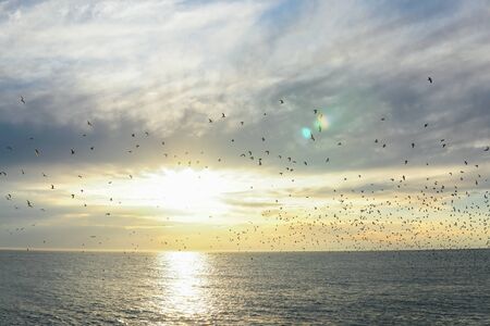 Large group flock of seagulls on sea lake water and flying in sky on summer sunset, toned with film effect
