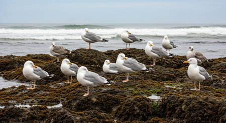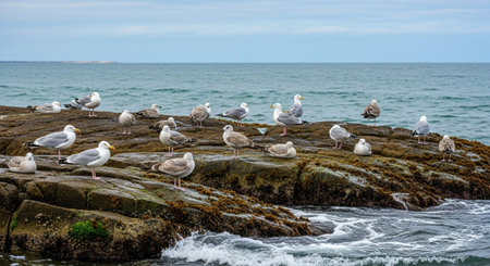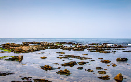 Seagulls on the rocks by the sea in Homigot beach, Pohang, South Korea.