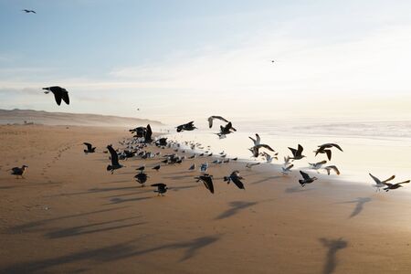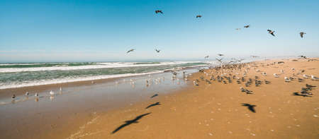 Flock of birds flying on the beach, beautiful cloudy sky background, panoramic view