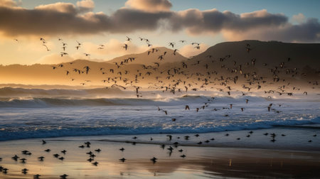 beach scene with Seagulls and birds at sunrise flying across the water with waves breaking in the background