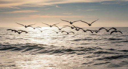 Numerous birds are depicted in flight over the ocean during sunset, bathed in warm hues. The composition features a textured water surface reflecting the sunlight. This image could be suitable for various commercial uses, including advertisements, websites, or editorial content.