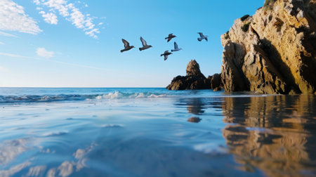 A peaceful coastal landscape featuring birds in flight above tranquil waters and a rugged rocky shoreline under a stunning blue sky.